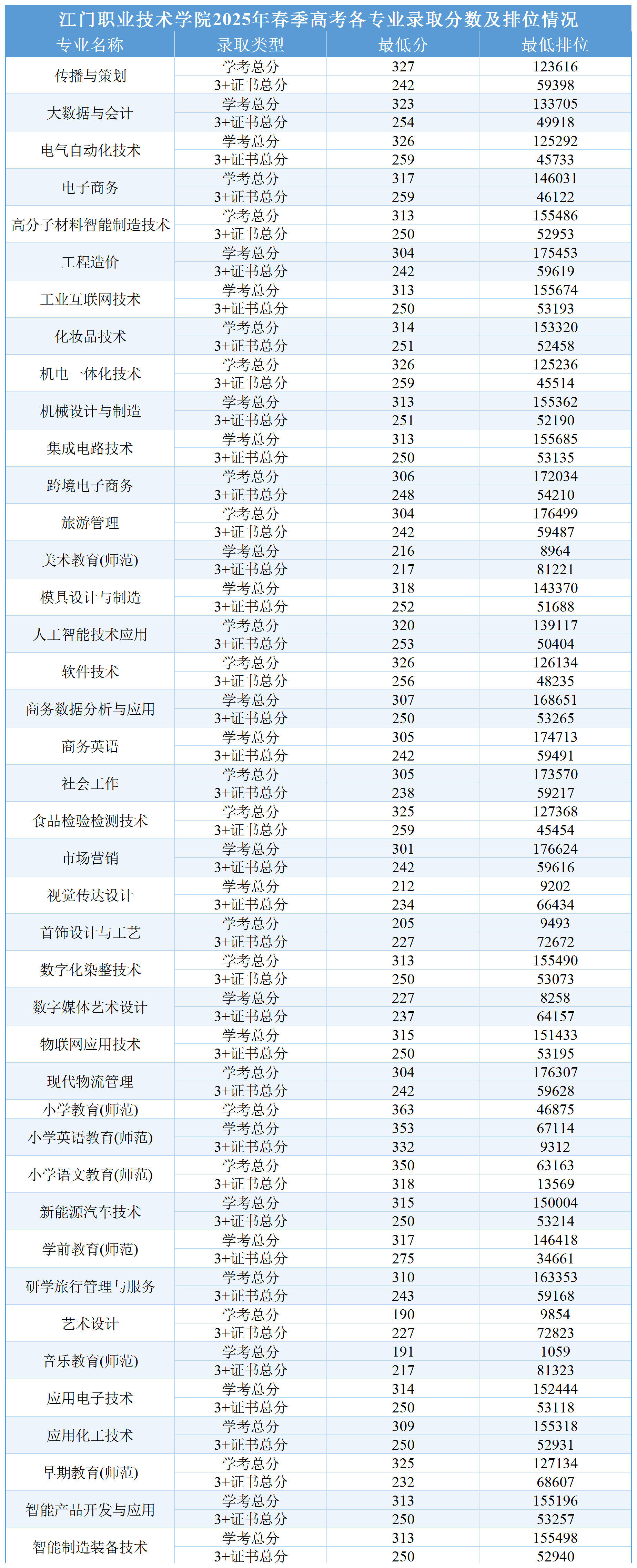 江门职业技术学院2025年春季高考各专业录取分数及排位情况