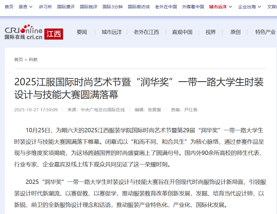 10月25日,为期六天的2025江西服装学院国际时尚艺术节暨第29届“润华奖”一带一路大学生时装设计与技能大赛圆满落下帷幕。闭幕式以“和而不同、和合共生”为核心脉络,通过参赛作品呈现与多维度奖项揭晓,为这场跨越国界的时尚盛宴画上了圆满句号。国内外90余所高校的师生代表、行业专家、企业嘉宾及线上线下观众共同见证了这一荣耀时刻。