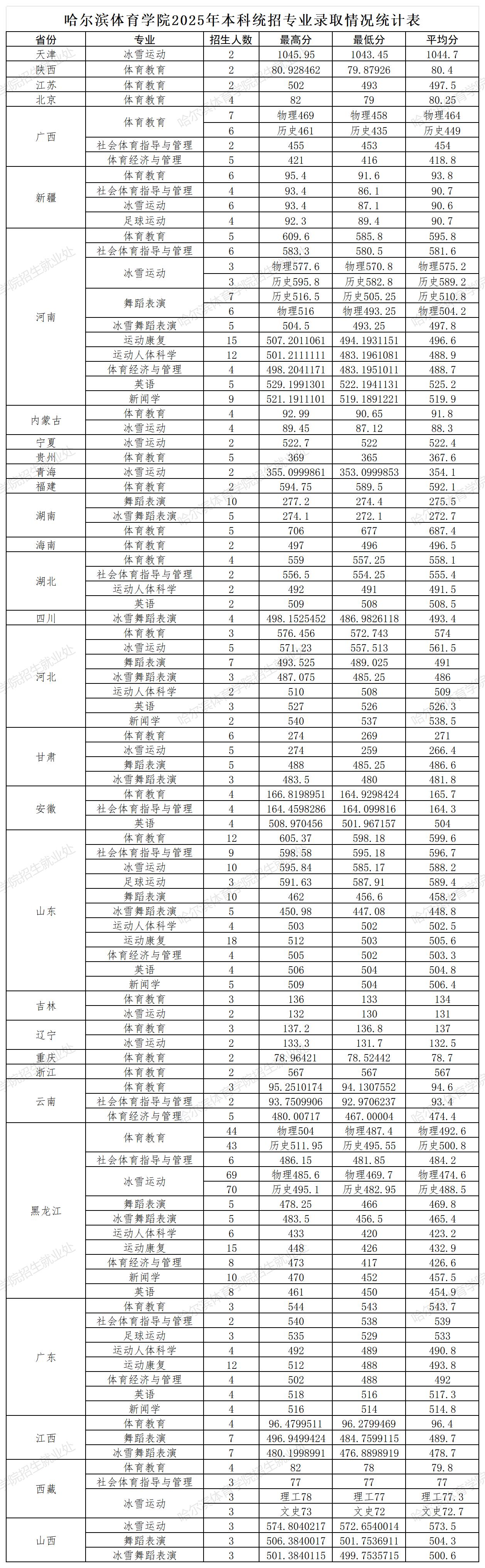 哈尔滨体育学院2025年本科统招专业录取情况统计表