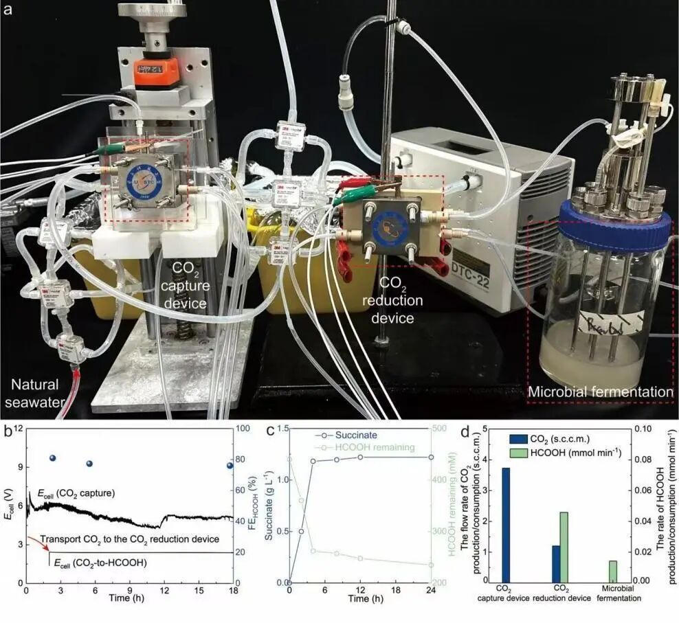 未来,研究团队计划在沿海地区构建集成化的“绿色工厂”。一方面,依托电催化装置持续从海水中捕获二氧化碳并转化为甲酸。另一方面,通过发酵罐中的工程菌将甲酸高效转化为绿色塑料原料。随着技术不断优化与大规模应用,该研究将有效缓解海水酸化问题,构建“捕碳-产料-制品”一体化绿色产业链,真正实现“边捕碳、边产料”的可持续生产模式,为我国“蓝色经济”高质量发展注入强劲绿色动能。
