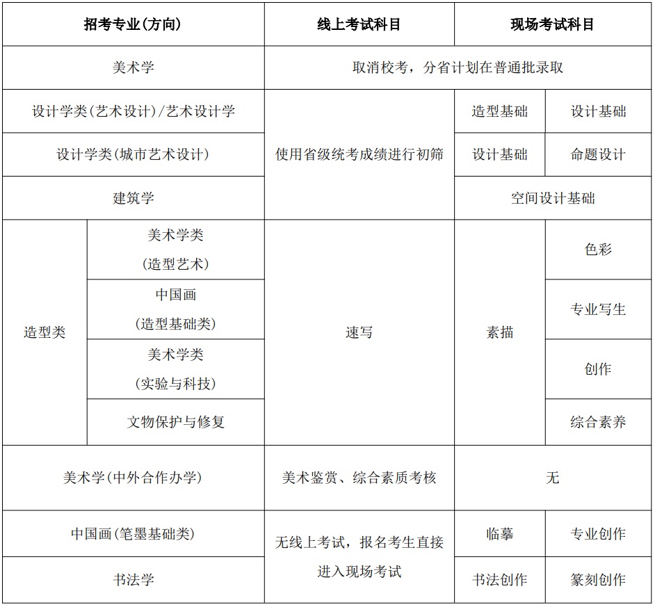 备注:1.造型类专业《速写》科目、美术学(中外合作办学)专业《美术鉴赏》《综合素质考核》科目采用线上考试进行。《速写》科目考试时长为2小时。2.建筑学专业《空间设计基础》考核说明考查考生是否具备学习建筑类本科专业所需的基本技能和艺术素养。具体考查考生的空间想象能力和几何基础知识,以及处理透视关系、明暗层次,塑造空间感和场景氛围的造型能力和色彩修养。考试时间为3小时。3.文物保护与修复专业《综合素养》考核说明考查考生对文物及艺术品保存修复专业所需跨学科基础的掌握情况。重点考查考生在美术、自然科学、人文社科等方面的基础知识,以及综合运用多学科知识分析和解决实际问题的能力与素养。考查内容既包含中学阶段自然科学、人文社科等基础知识,也包含美术鉴赏与绘画临摹等基础艺术素养与实践能力。考试时间为3小时。