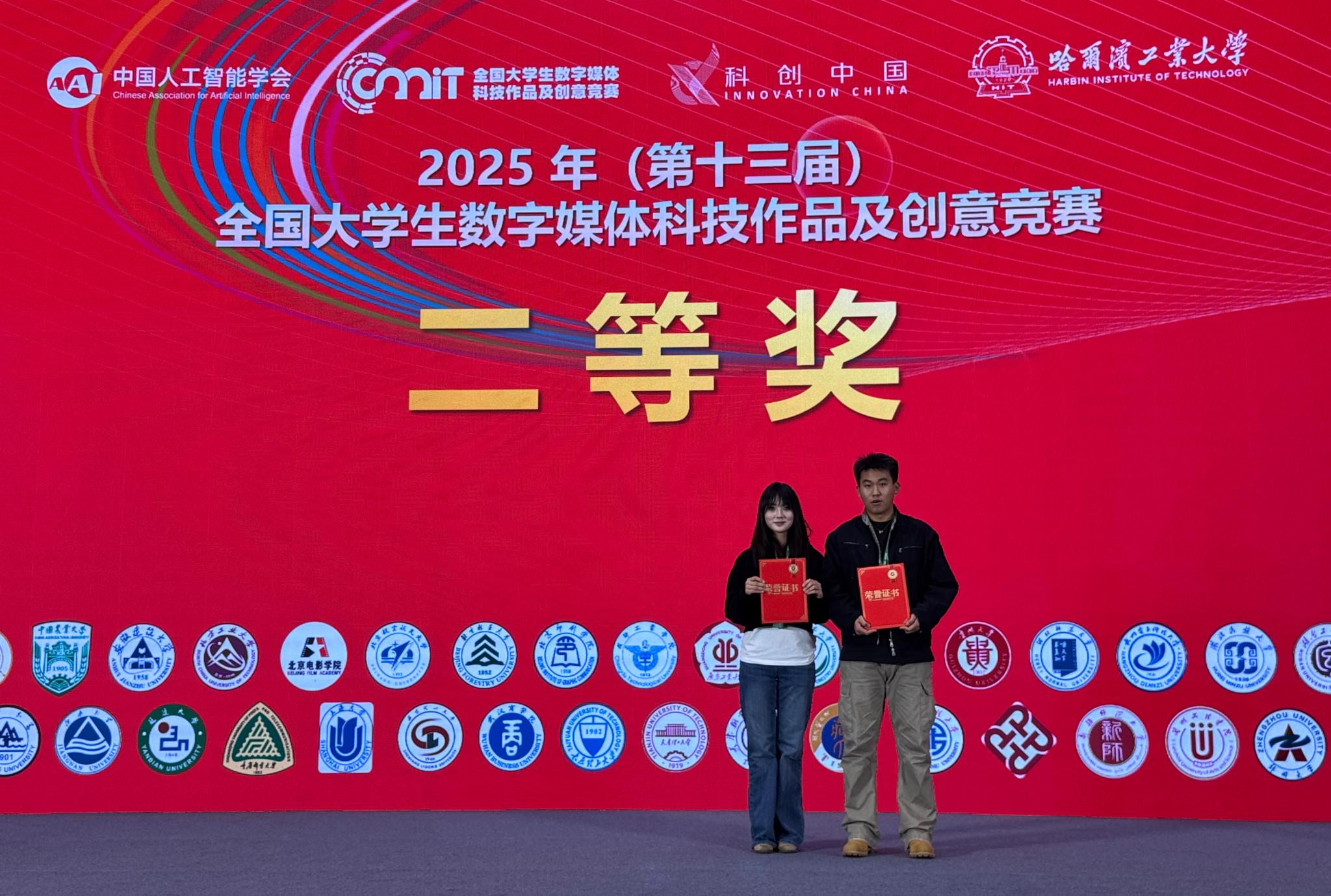10月26日,2025年全国大学生数字媒体科技作品及创意竞赛全国现场总决赛在哈尔滨工业大学举行。我校美术与设计学院视觉传达系师生团队在比赛中表现突出,在“数字艺术表现”及“AIGC类数字创意作品创作”两个赛道中分别获得国家级二等奖两项。此外,在吉林赛区竞赛中荣获省级一等奖2项、省级二等奖3项、省级三等奖2项。