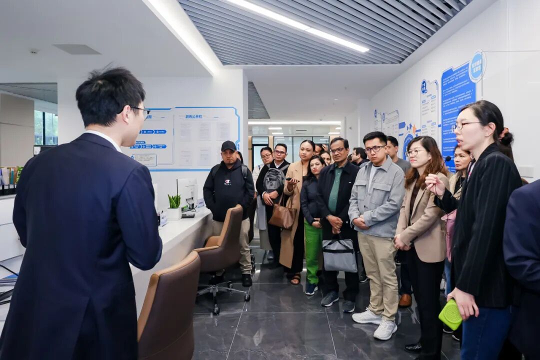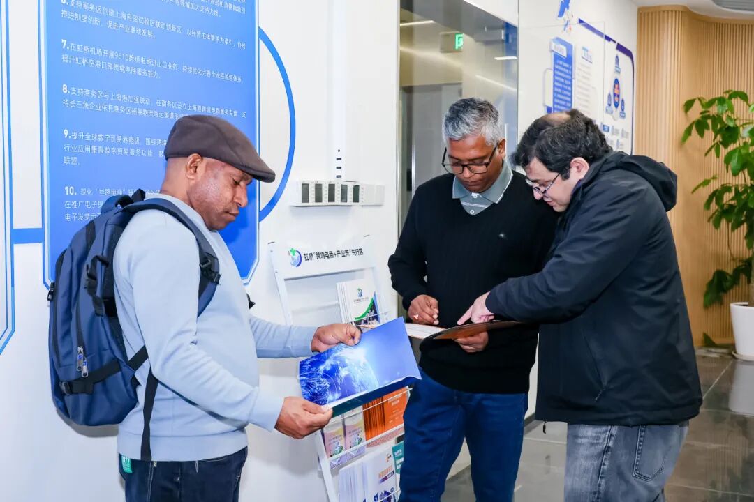上午,参访团首站抵达位于青浦区的虹桥“跨境电商+产业带”先行区。工作人员介绍了该先行区关于工商注册、税务咨询、合规框架搭建等“一站式”政务服务模式,引发了学员们的热切关注。