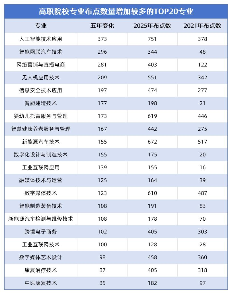 对于正处于学业规划关键期的高中生而言,未来的专业选择不仅关乎个人兴趣,更与产业发展、社会需求紧密相连。在高等职业教育领域,近五年有一批专业的布点数量大幅增长,它们的“走红”是产业浪潮推动下的必然结果。今天,我们就聚焦其中布点数增加较多的TOP20专业,看看这些专业为何备受青睐。