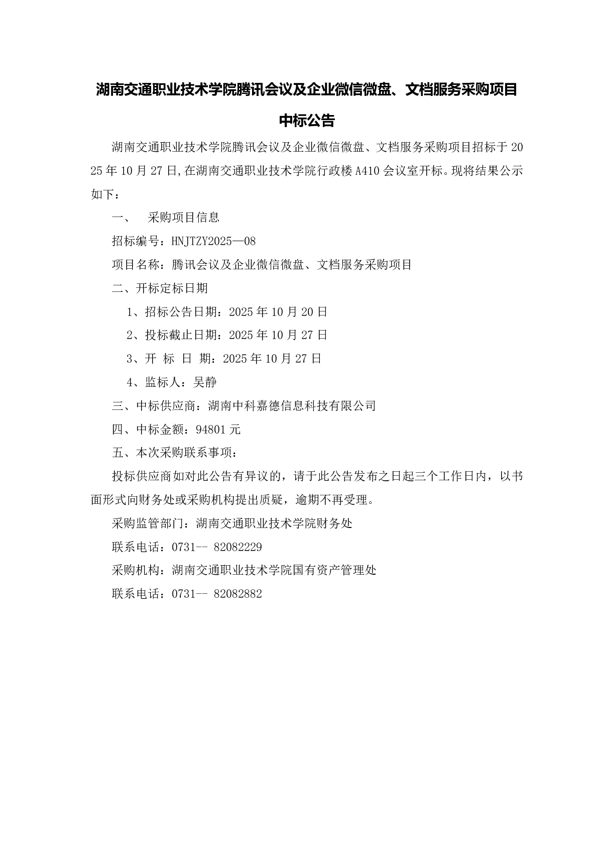 学院腾讯会议及企业微信微盘、文档服务采购项目中标公告