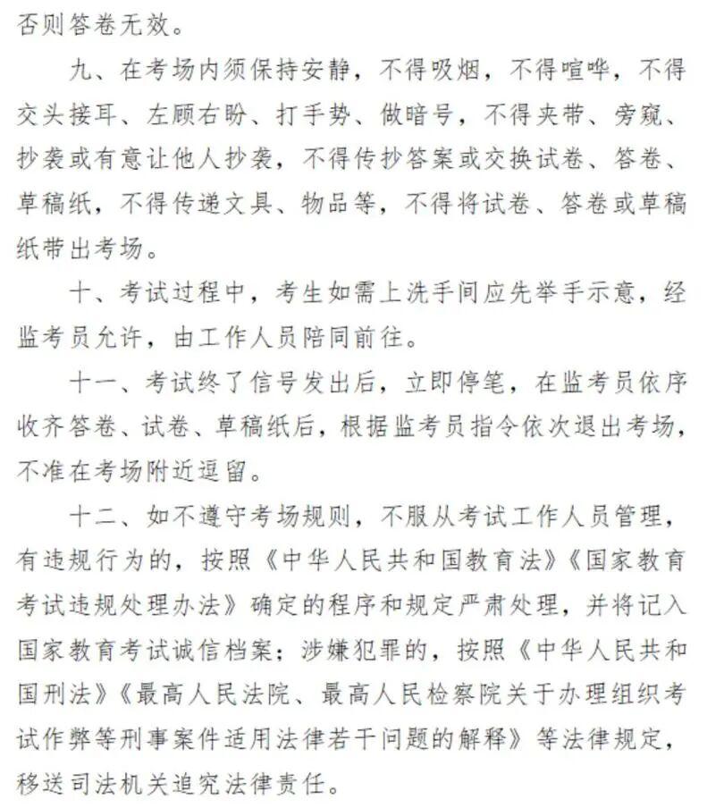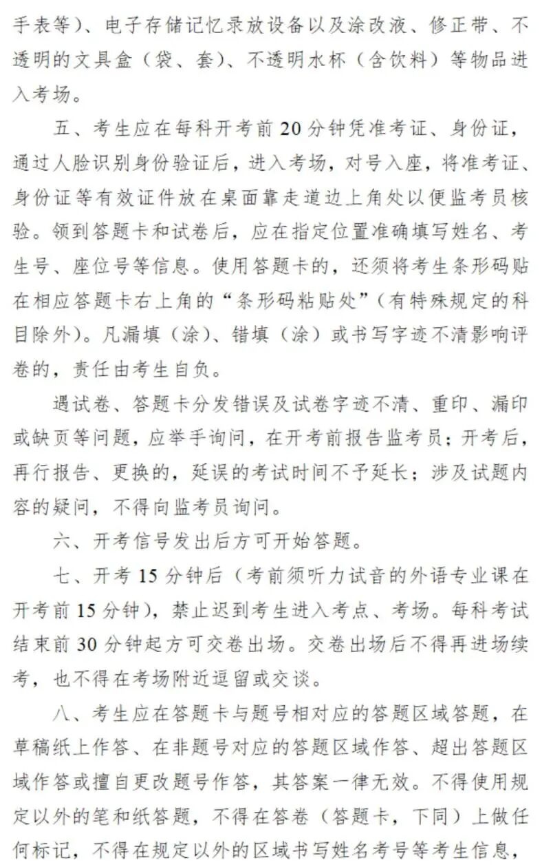 考生凭准考证和身份证(现役军人身份证件)按规定时间和准考证上各科目的考场、座位号参加考试。社会外校车辆禁止入校,请提前熟悉考点、考场位置及路线。