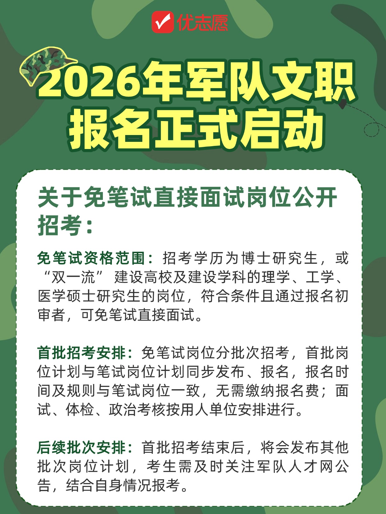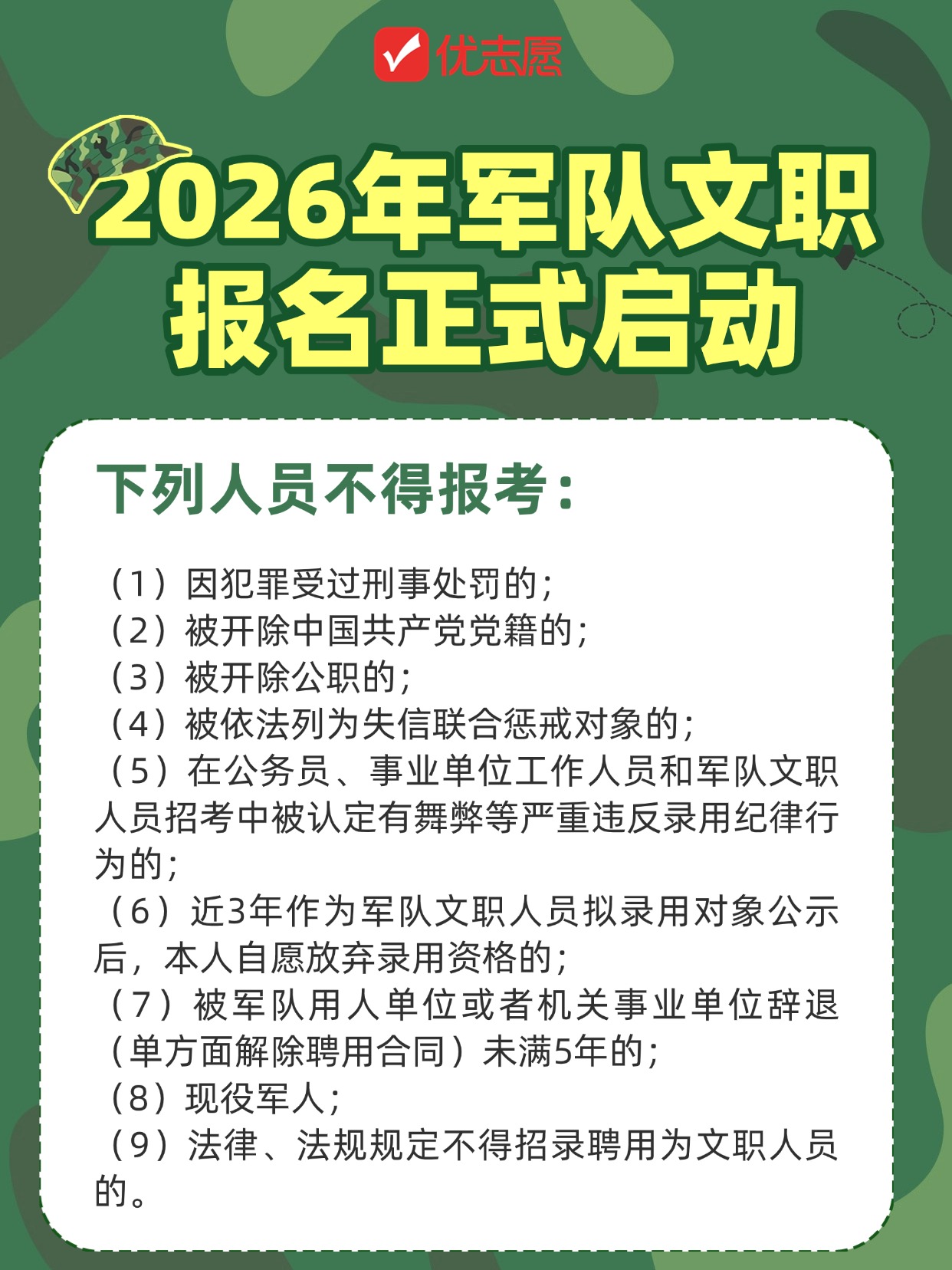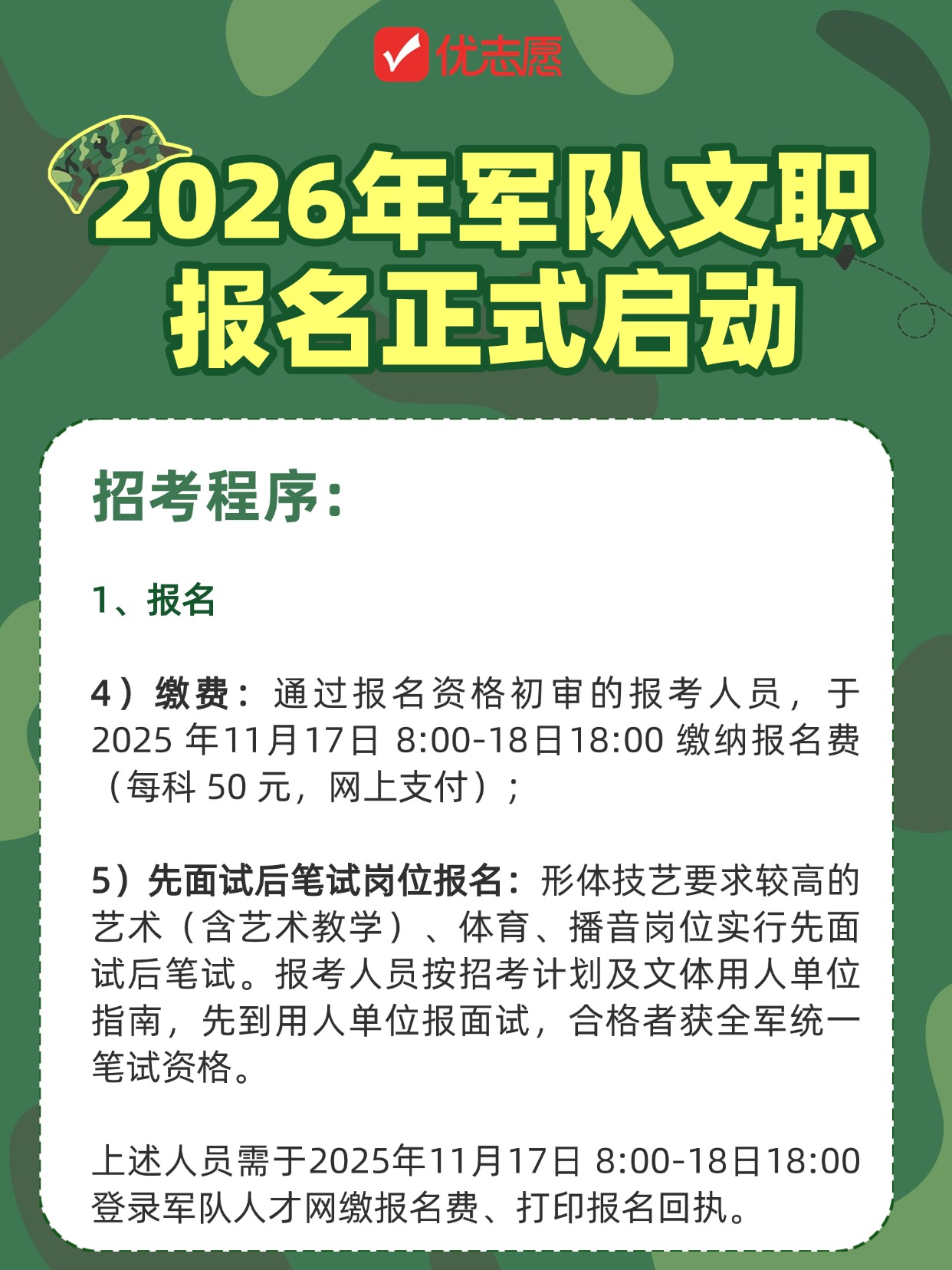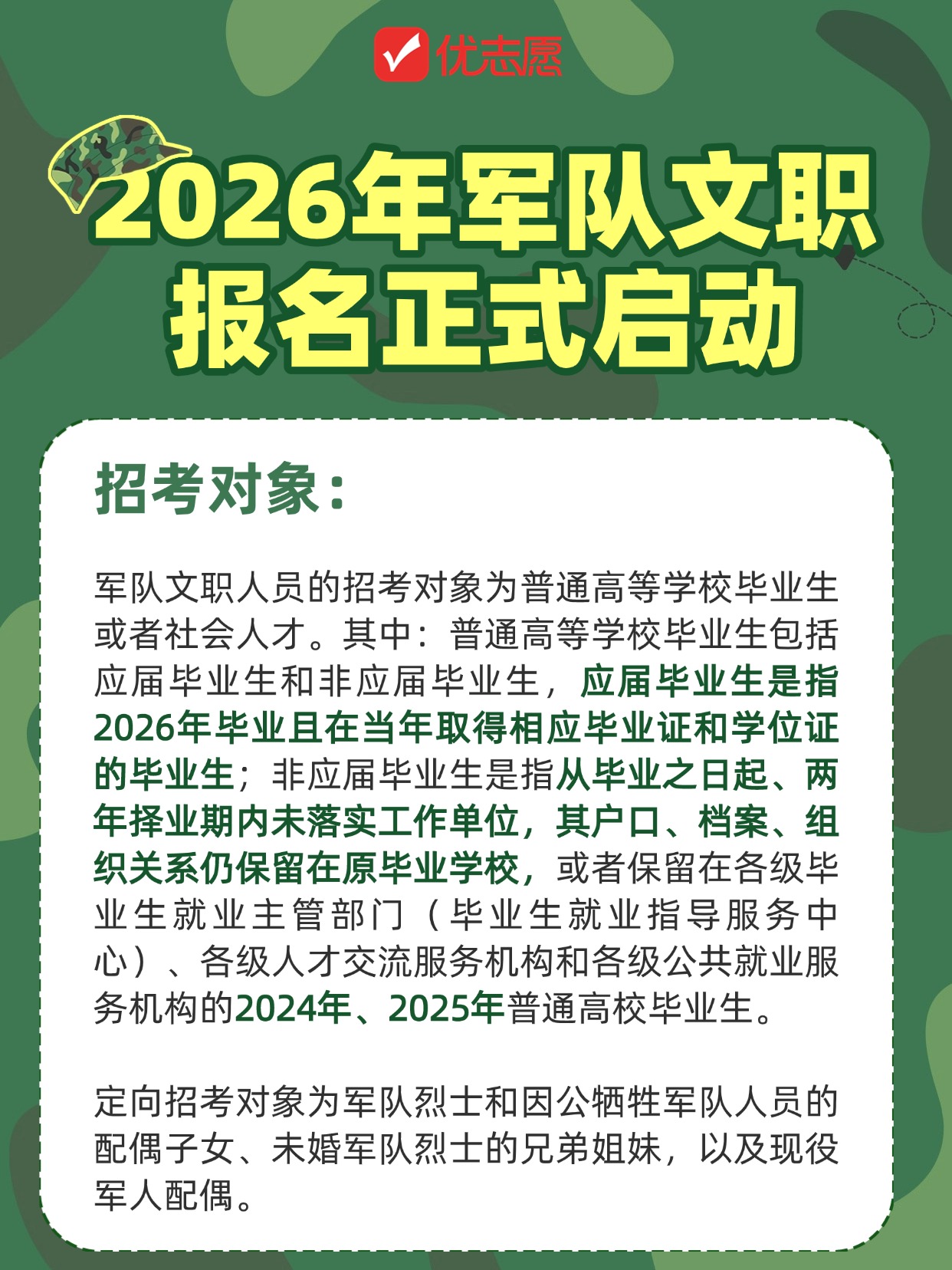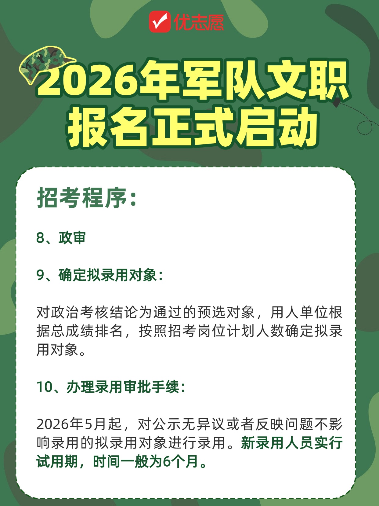 2026年军队文职报名已正式启动,具体的报考条件有哪些?招考流程和具体的时间节点又是如何?快跟优志愿一起了解!
