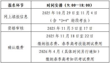 春季高考报名分为网上填报信息、资格审核、确认缴费等3个阶段。具体时间安排如下: