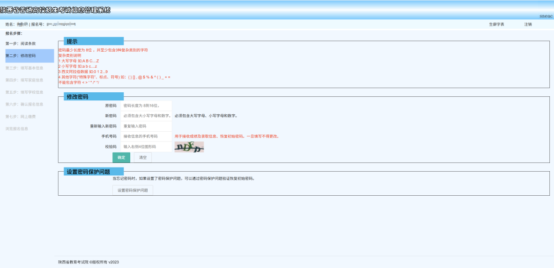 2.修改密码时,应填写长期使用的手机号码用于接收成绩及录取信息、恢复初始密码。