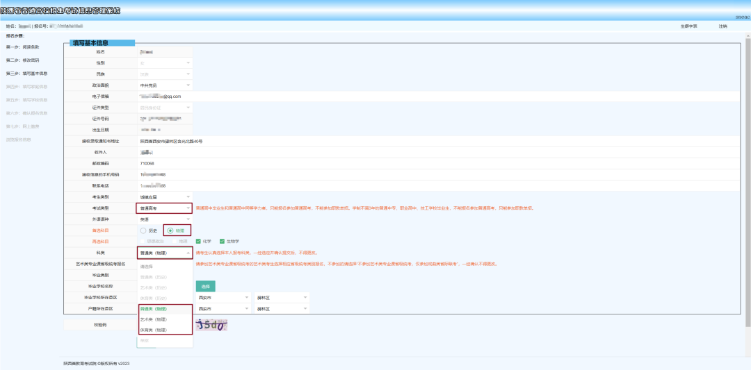 3.填写基本信息时,应正确选择政治面貌、考生类别、考试类型、外语语种、科类、首选科目、再选科目、毕业类别等选项。基本信息填写完成核对无误后确认提交。