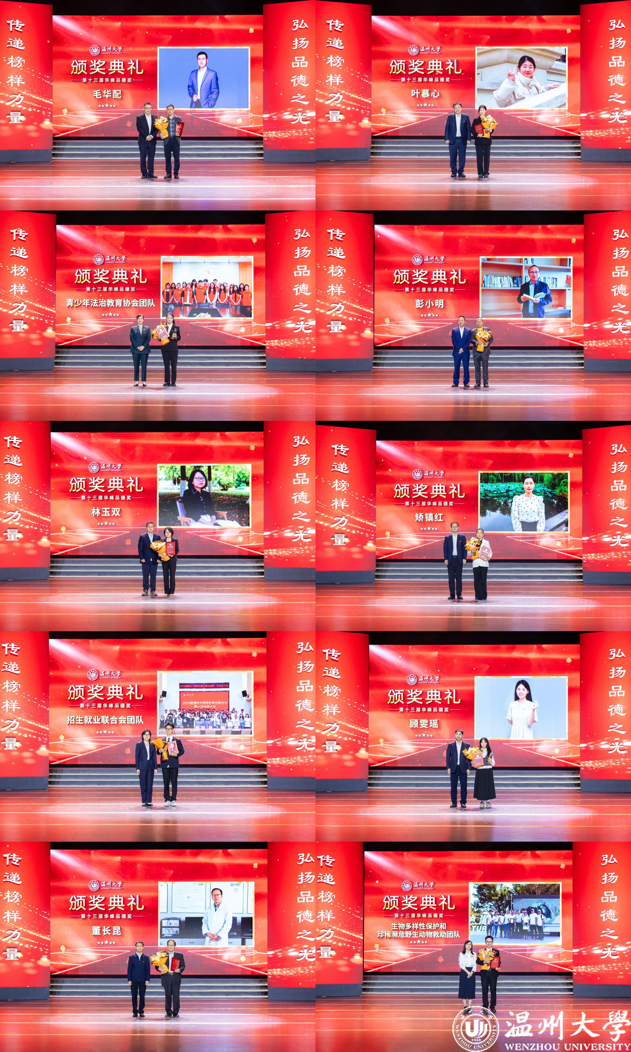 颁奖典礼现场,毛华配、叶慕心、林玉双、顾雯瑶、矫镇红、彭小明、董长昆、珍稀濒危野生动物救助团队、青少年法治教育协会团队、招生就业联合会团队10位道德模范个人(集体)获表彰奖励。校领导与华峰集团领导分别为获奖者颁奖,致敬多元领域的品德标杆。