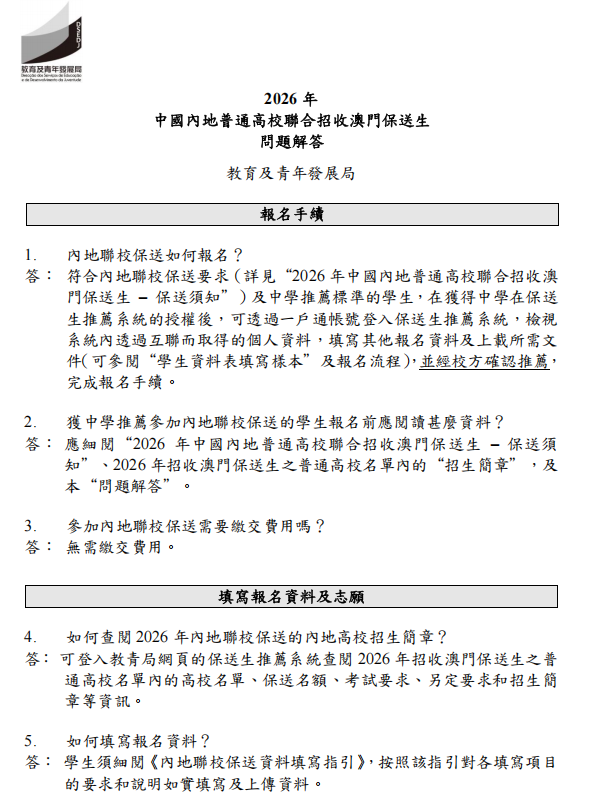 更多内容:2026年中國內地普通高校聯合招收澳門保送生︱ 問題解答(点击查看)