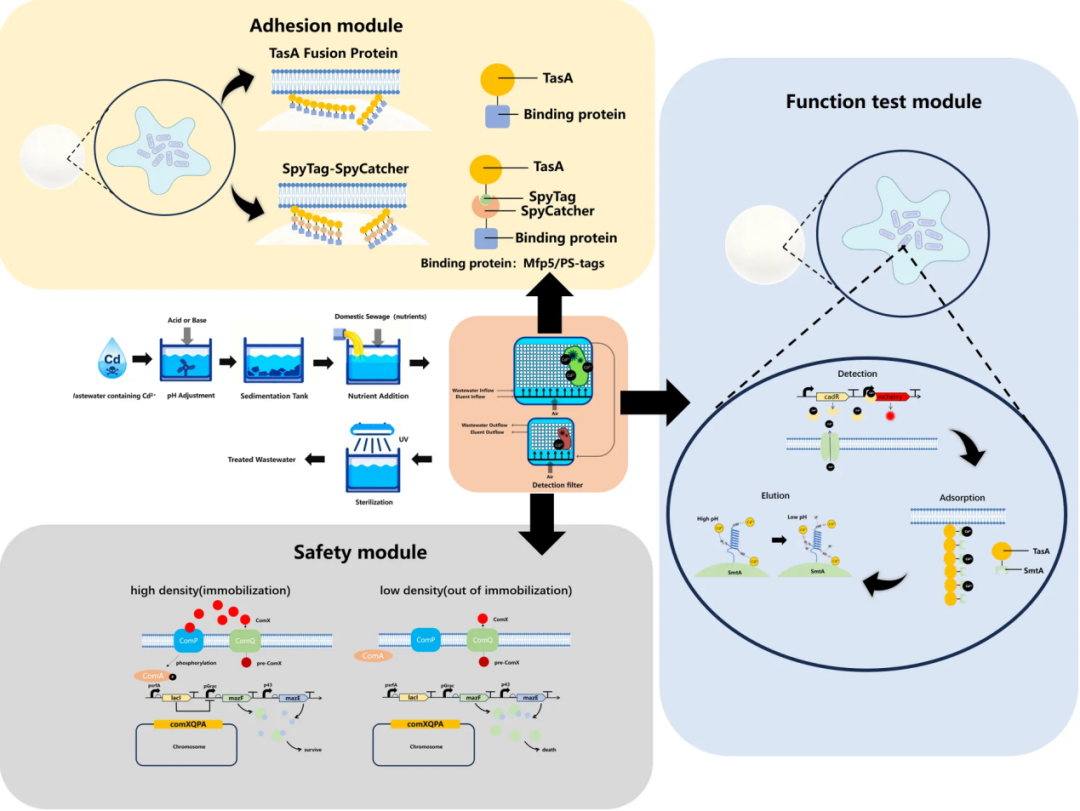 在此基础上,四川大学SCU-China代表队进一步将平台升级为一个集镉离子 “感应-吸附-回收” 功能于一体的全流程工作站,实现了对重金属污染水的闭环治理。项目还设计了一套基于群体感应的生物安全防护机制,能有效防止工程菌的环境泄漏,确保了技术的环境友好性与安全性。该平台展现出强大的模块化潜力,未来可通过替换不同的功能蛋白,广泛应用于多种污水处理场景,不仅为合成生物学解决实际环境问题提供了创新性的“川大方案”,更展现了该方案从实验室走向应用的巨大潜力。