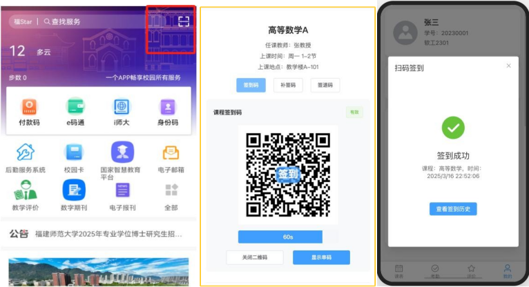 室内课:课前,教师在教室大屏幕上展示“签到二维码”。打开“福Star”APP,点击右上角的“扫一扫”,轻松完成签到。