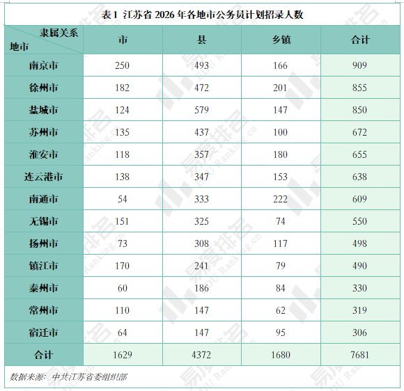 下表展示了江苏省2026年各地市公务员计划招录情况,13个地级市共计划招录7681人,其中市级单位共计划招录1629人,县级单位共计划招录4372人,乡镇单位共计划招录1680人。县级单位招录占比整体较大。