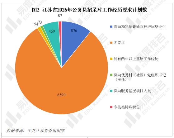 江苏省2026年公务员省考有约80%的计划对工作经历无要求,有10%以上计划仅面向2026届高校毕业生,90%以上的招录计划面向应届生开放,利于促进高校毕业生就业。