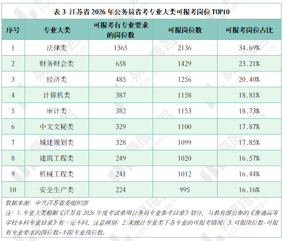 表3统计了江苏省2026年公务员省考可报考岗位TOP10的专业大类,本次公务员招录有771个岗位对专业没有限制。有1365个岗位明确要求法律类专业报考,法律类专业可报考岗位数在所有专业大类中遥遥领先,考公优势十分明显。
