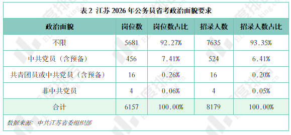 下表展示了2026年江苏省考公务员招录对政治面貌的要求情况。其中有456个岗位要求政治面貌为中共党员(含预备),有16个岗位要求共青团员或中共党员(含预备),不限政治面貌岗位数量占比超90%,不限政治面貌岗位为各类人才提供了平等的竞争机会,在一定程度上体现了公务员招录的公平性。