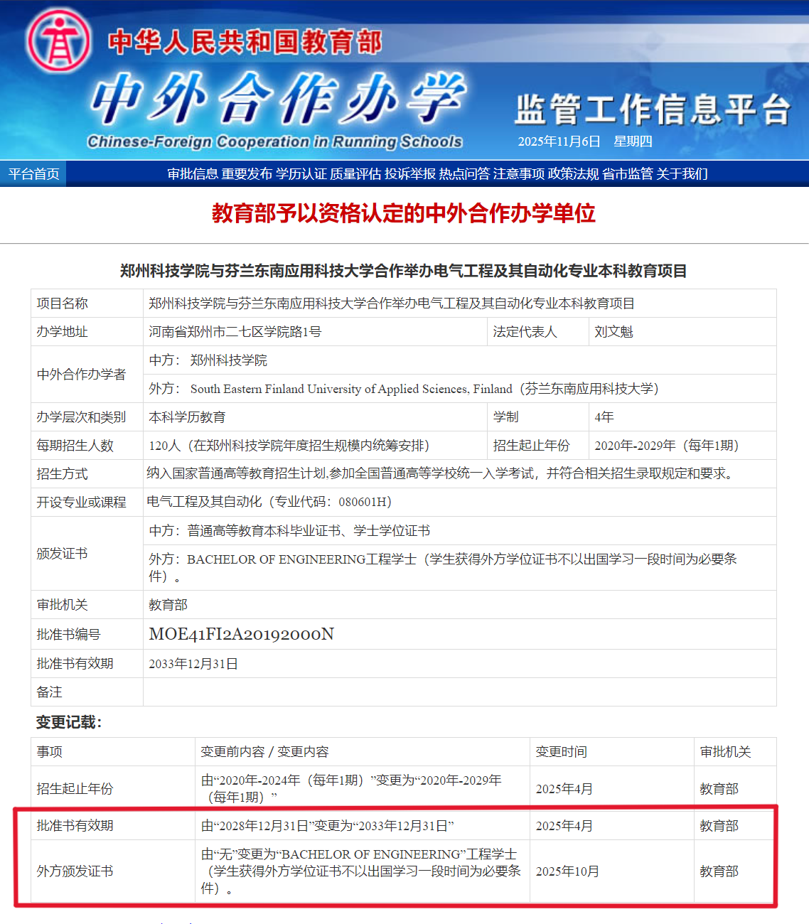 近日,我校与芬兰东南应用科技大学合作的电气工程及其自动化本科教育项目正式获批升级为“4+0”双学位项目,相关信息已在教育部中外合作办学监管信息平台公布。该项目成为河南省唯一可同时授予中国工学学士学位与欧洲工程学士学位的中外合作办学项目,标志着我校国际化办学水平迈上新台阶。