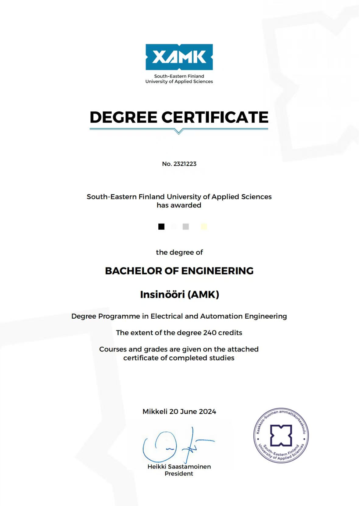 自2026年9月起,就读该项目的中外学生在完成四年学业并达到毕业要求后,将获得我校本科毕业证书与学士学位证书,同时满足芬方学位授予条件的情况下,无需出国即可同时获得芬兰东南应用科技大学颁发的工程学士学位证书(Bachelor of Engineering)。