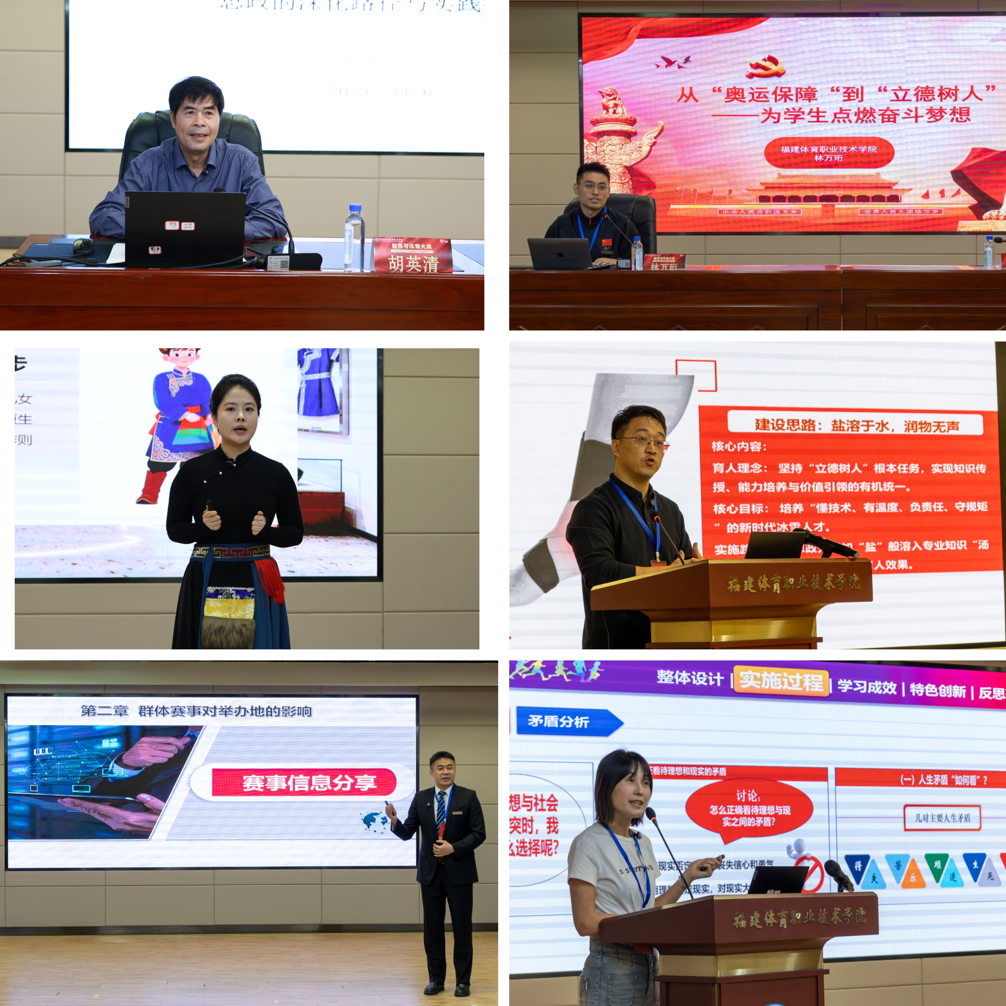 在课程思政展示环节,来自不同体育职业院校的省级课程思政项目负责人纷纷登台,展示了他们在课程思政教学中的创新成果。湖南体育职业技术学院陈雅琴讲师带来了“跟着‘非遗’舞中国”,将非物质文化遗产与安代舞教学相结合,让学生在学习舞蹈技巧的同时,了解和传承中华优秀传统文化,增强文化自信。黑龙江冰雪体育职业学院张森副研究员以“立德树人 护佑安全”为题,分享了在冰雪体育运动损伤预防教学方面开展生命教育与职业操守、规则意识与体育精神教学的经验和方法;福建体育职业技术学院李民桂副教授展示了“群体赛事践行‘共同富裕’文化表达”,从经济共荣、社会共情、文化共建三个维度,探讨群体赛事在促进共同富裕中的作用。浙江体育职业技术学院刘洪讲师以“理想信念是精神之‘钙’”为题,展示如何通过生动的案例,引导学生树立正确的理想信念和价值观。每位教师的展示都各具特色,充分体现了体育职业课程思政的多样性和有效性。