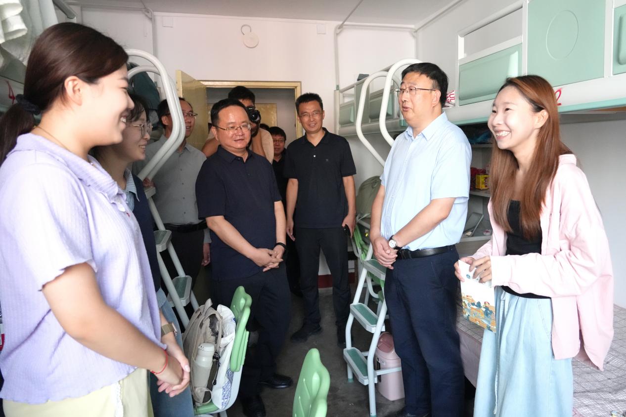 王仰麟、卢宇鸿、郝平来到大同校区迎新点了解各学院的新生报到情况。“大家辛苦了”“有多少学生报到了”,王仰麟一行与工作人员和志愿者亲切交流,询问了解新生报到、服务保障等情况,察看了各学院精心准备的新生大礼包,向他们辛勤的工作表示感谢。在云中体育馆,大屏幕上同步显示着各学院新生报到的实时数据,王仰麟一行来到注册点详细查看新生报到流程,同现场报到的新生亲切交谈,了解他们的报到体验和初到校园的感受。“家是哪里的?”“对学校的环境感受如何?”王仰麟一行走进学生宿舍和餐厅,与新生和家长热情互动,感谢家长们对学校的信任和认可并请家长们放心,勉励勉励学子要脚踏实地,扎实学好专业知识,为未来实现人生理想打下坚实基础。