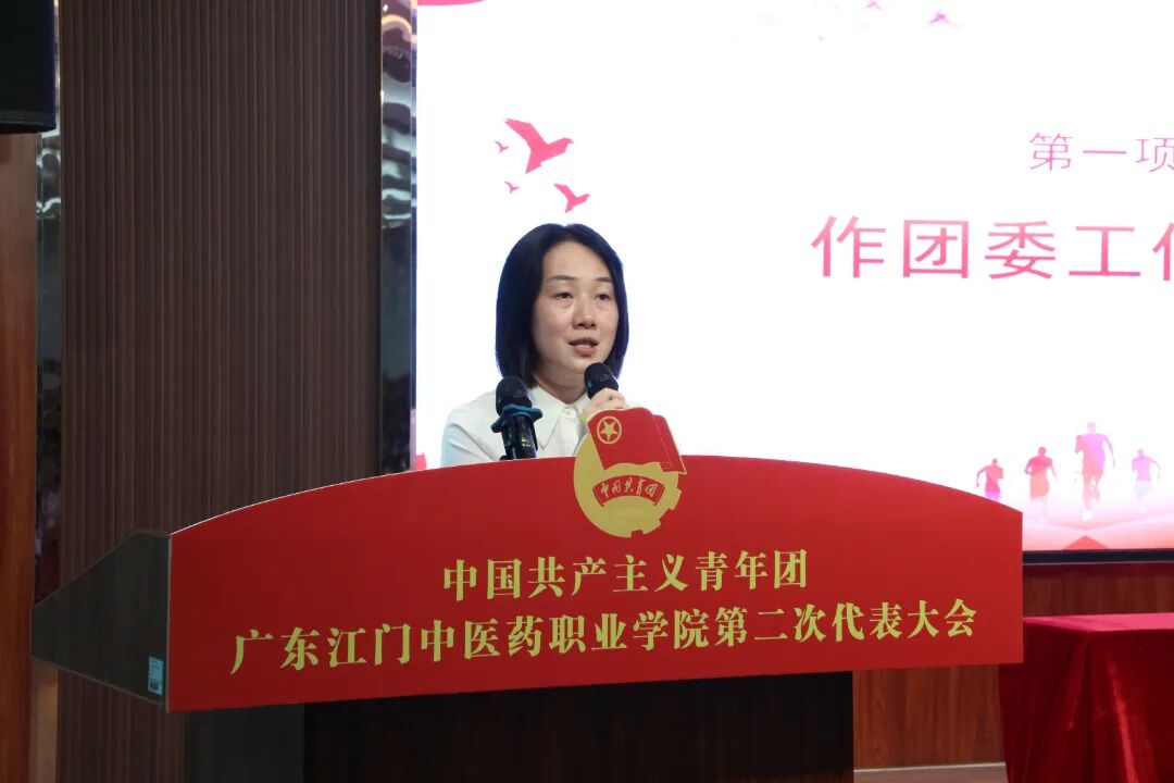 共青团广东江门中医药职业学院第一届委员会书记张彩虹代表上届团委作工作报告,系统回顾了过去几年学校共青团在思想引领、组织建设、实践育人、服务青年等方面取得的成效,明确了未来五年的工作目标和重点任务。报告经全体代表审议并一致通过。