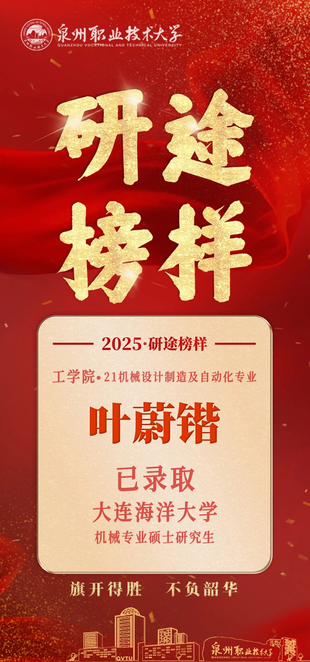 回想起自己从中专一路考到本科,再到如今成为硕士研究生的历程,感慨万千。我的母校是漳州第一职业中专学校,在读中专时,内心总有个声音告诉我不能安于现状。于是我利用各种时间拼命学习,那些晦涩难懂的专业知识,还有升学的文化课内容,常常让我学到深夜,可每攻克一道难题,就多了一分自信。