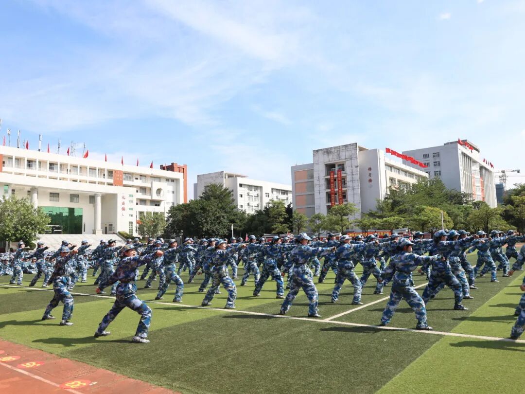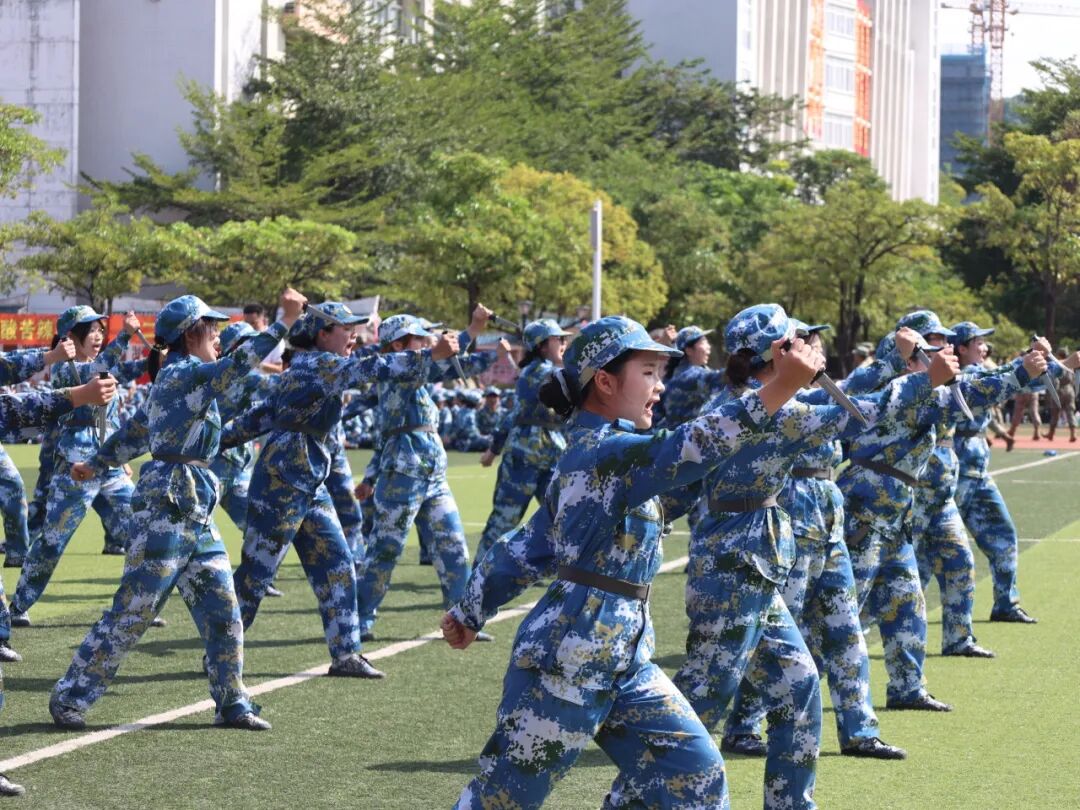 随后,精彩的军训成果展示轮番上演。在合唱战斗歌曲《当那一天来临》《强军战歌》环节,学子们歌声雄浑激昂,唱出了矢志报国的赤子情怀;在军体拳表演中,同学们动作刚劲利落、整齐划一,拳拳生风间尽显少年意气;刺杀操与匕首操展示更是将现场气氛推向高潮,学子们神情专注、招式标准,出枪迅猛、挥匕果断,全方位呈现了军训成果。