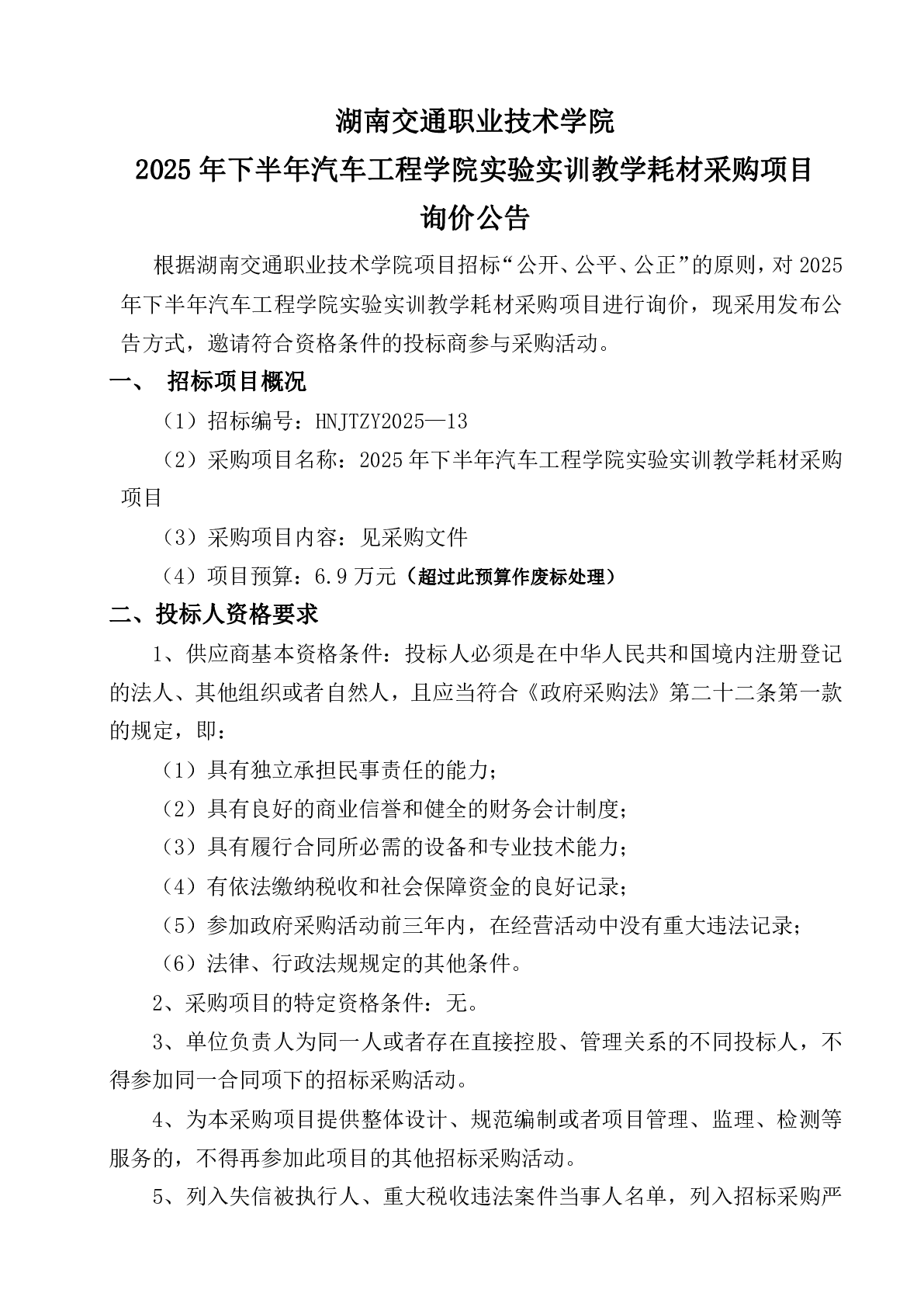 学院2025年下半年汽车工程学院实验实训教学耗材采购项目询价公告