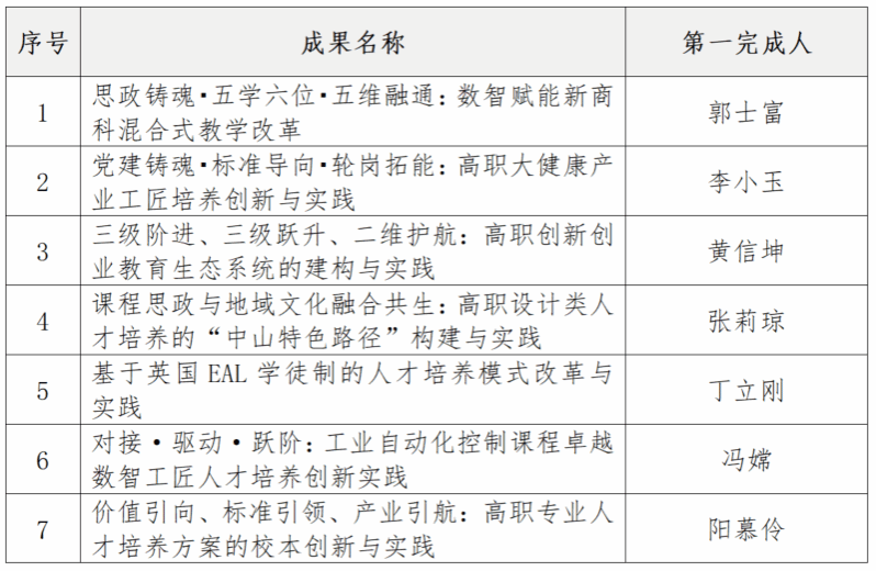 经校内各部门、各二级学院(教学部)积极申报,教务部对申报材料进行形式审查,学校党组织、成果合作单位对校内、校外成员的政治表现、师德师风、廉政情况进行核实,教务部委托教学质量监测与评估中心组织校外专家评审,根据校外专家评审结果,并经学校教学委员会、学校学术委员会审议通过,拟推荐《思政铸魂・五学六位・五维融通:数智赋能新商科混合式教学改革》等7个教学成果申报中山市第十四届教学成果奖(职业教育),具体名单如下。现予以公示,公示时间2025年11月17日至2025年11月19日。