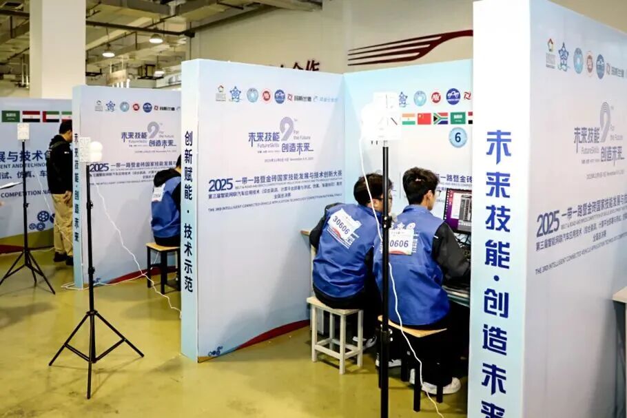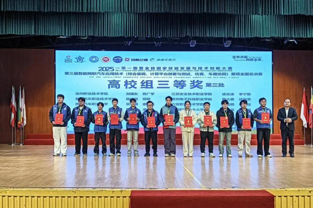 2025一带一路暨金砖国家技能发展与技术创新大赛第三届智能网联汽车应用技术全国总决赛,是一项高水平国家级赛事,旨在为智能网联汽车产业培养前沿技术技能人才。赛项全面覆盖产业核心环节,是推动产教融合与产业升级的重要平台。我校学子吴家骥,谢文强在这一高水平竞技平台上斩获殊荣,充分展现了学校在智能网联汽车领域卓越的人才培养质量与产教融合的丰硕成果。