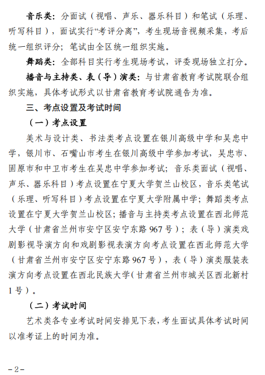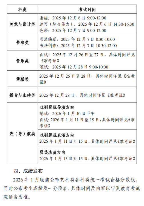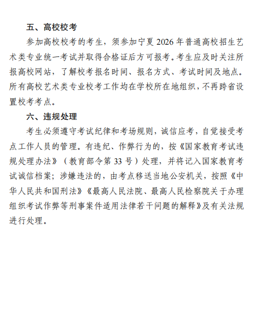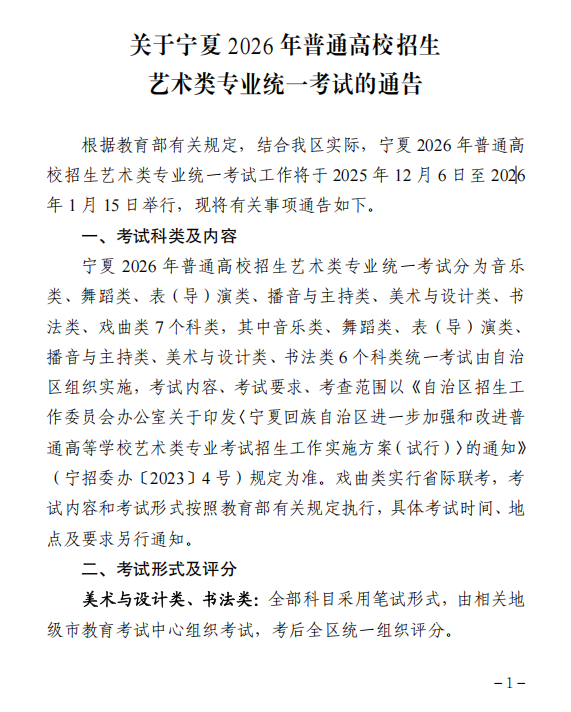 宁夏2026年普通高校招生艺术类专业统一考试的通告