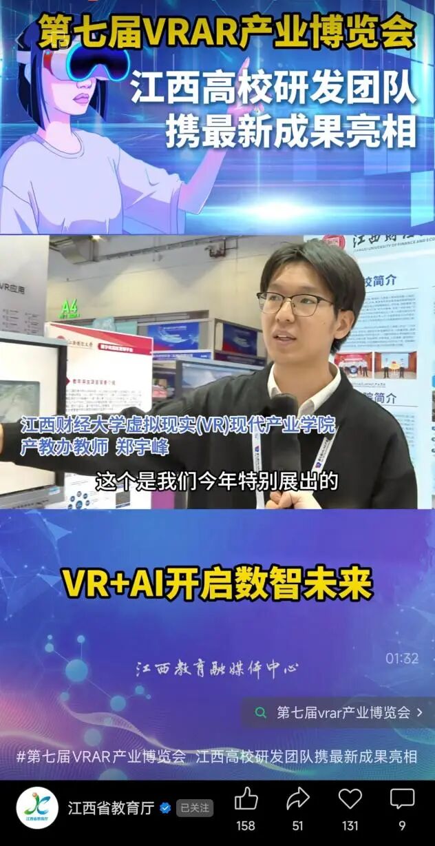 据悉,中央电视台一套《晚间新闻》栏目、江西省教育厅官方视频号关注我校在第七届VR/AR产业博览会上在协同育人与前沿科研等方面的丰硕成果展示。
