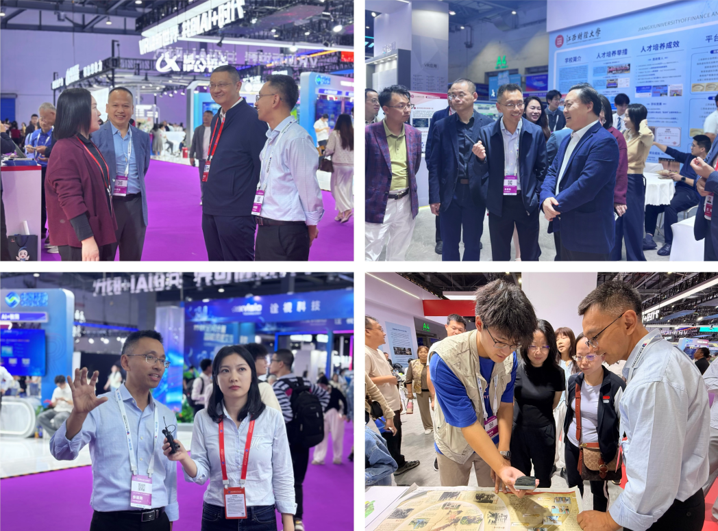 移步至校企合作区,多层次、全过程的校企共育体系引起了领导的浓厚兴趣。学院开设四类产教融合实验班,累计组建132个班级,创新性推行“项目制”与“竞赛型”课程、技术训练营和学硕工作室等教学形式,实现了人才培养与产业需求的无缝对接。与中国VR前3强企业宏达通讯有限公司(威爱科技集团)合作的“江西省5A景区漫游”,与中国VR50强企业江西中直新经济合力打造的“八角楼·十二时辰”数智体验项目,与江西日报联合出品的全国首张AR交互报纸,为广州卓远“幻影星空”平台开发的四部热门VR影视作品,与金创科技合力开发的缺陷产品检测与剔除及数字化转型提档升级系列项目,与江西脑控合作开发的“AI自传”APP等项目,吸引了领导、专家和众多观众的长时间驻足。