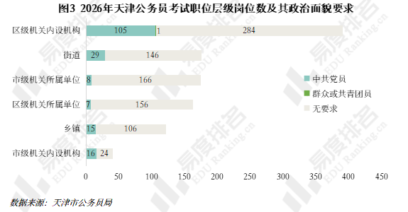下图展示了2026年天津市考公务员招录对政治面貌的要求情况。无政治面貌是绝对主体,覆盖了83%的职位。有明确要求的岗位占比较少,180个职位面向中共党员,仅1个职位限定群众或共青团员。此外,市级机关对党员身份的要求明显更严,有40%的岗位要求申请人具备中共党员身份背景。