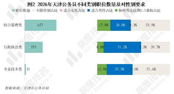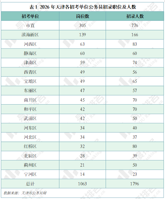 2026年天津市公务员统考共计划有1063个岗位,招录1796人。市直机关招录人数、职位数领先市内其它地区部门,招录人数占总人数的43%;滨海新区岗位数量位列第二,达到139个。