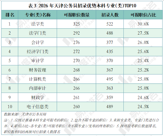 2026年天津公务员招录职位中,法学(门)类有关专业占据前二。其中法学类专业可报考的职位数量达到325个,占比30.6%,职位对应招录人数达到522人。相比计算机类、电子信息类等专业考公优势明显。