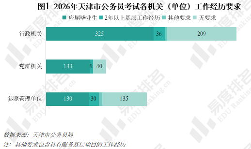 2026年天津公务员招录63.9%的岗位对经历有要求,行政机关以及党群机关要求应届毕业生的岗位占比分别达到56.4%、73.1%。要求2年以上基层工作经历职位占比约7%,对报考者工作经历有一定要求,相较于其它职位竞争较小。