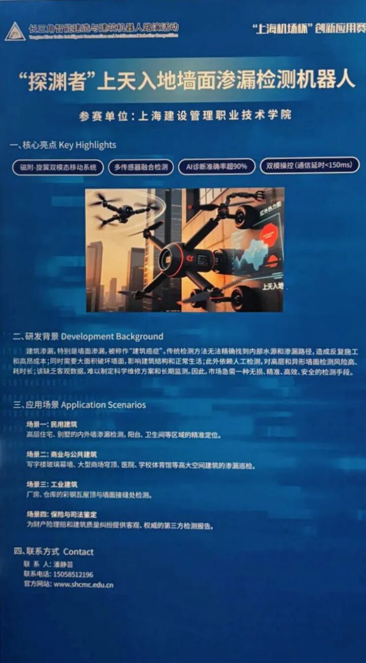 智能建筑工程学院长期注重产学研结合,积极推动学生参与高水平竞赛。在专业主任琚娟博士和专业教师王璞瑾博士的指导下,24智建31班潘静芸、伍悦、孙卓渲和24智建32班张佳鑫四位同学,依托学院智能建造创新平台,参与本次竞赛。他们以《“探渊者”上天入地墙面渗漏检测机器人》为作品主题,融合机器人技术、人工智能视觉与建筑工程知识,凭借创新设计和稳定表现,一举夺得铜奖和最佳创新奖。