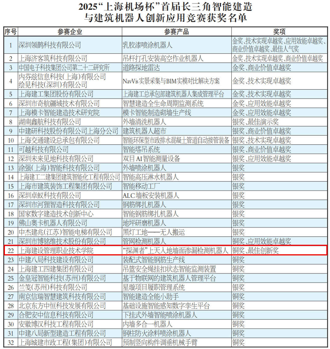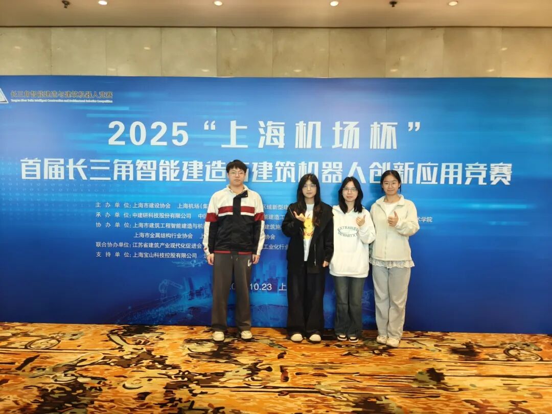 近日,2025“上海机场杯”首届长三角智能建造与建筑机器人创新应用竞赛在上海浦东机场华美达广场酒店举行。我校智能建筑工程学院师生在本次竞赛中获铜奖和最佳创新奖。本次大赛由上海市建设协会、上海机场(集团)有限公司、长三角区域新型建筑工业化协同发展联盟主办。大赛以工程真实应用场景为驱动,致力于为智能建造全产业链搭建一个集创新展示、技术交流、供需对接于一体的高端平台。与传统竞赛不同,本次大赛的核心是“场景驱动”,大赛将浦东机场T3航站楼等重大工程作为智能建造的“试验田”和“应用场”,让最前沿的技术在真实、复杂、高标准的施工环境中接受检验,真正以应用为导向,进而加速培育智能建造领域的新质生产力,为行业高质量发展锻造一支高技能的人才队伍。