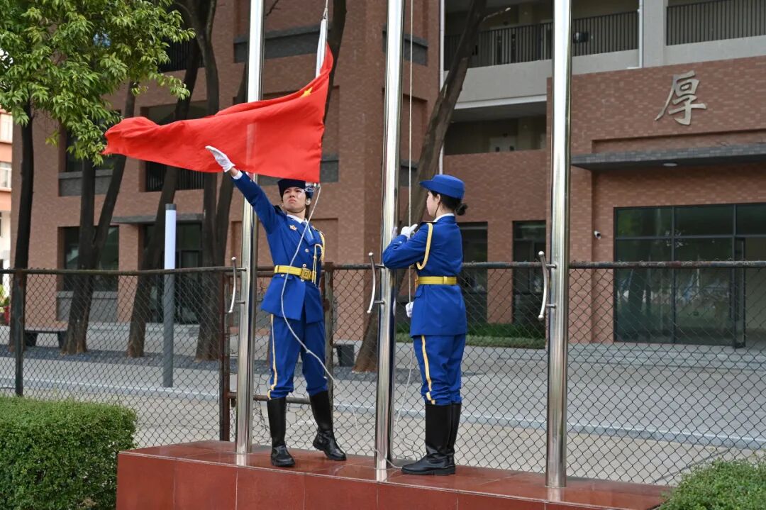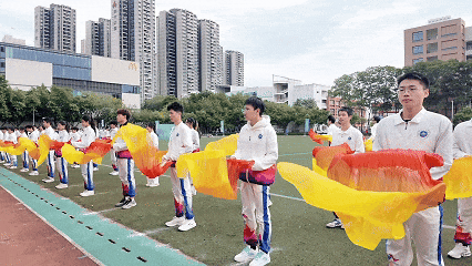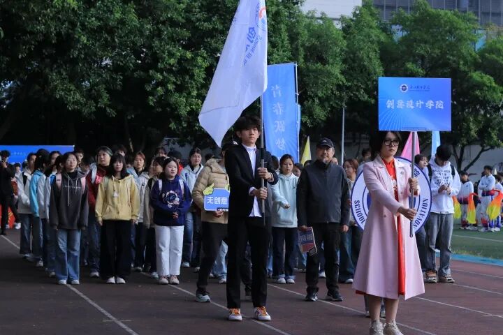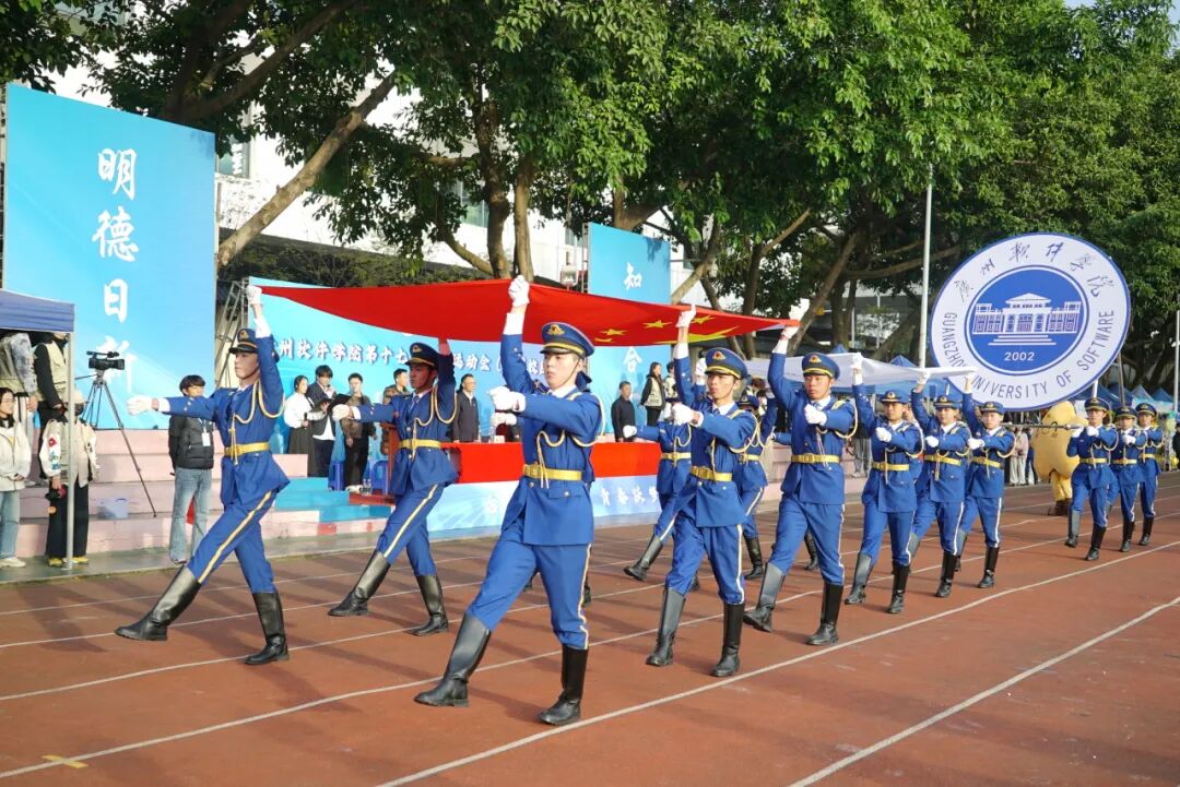步伐铿锵、气宇轩昂的国旗方阵庄严入场,熠熠生辉的五星红旗引领方向,彰显着新时代广软师生对祖国的热爱与敬意。紧随其后,校旗与校徽方阵荣耀登场,飘扬的旗帜与闪耀的徽章承载着“明德日新 知行合一”的广软精神,激励着广软学子将个人理想融入时代洪流,以强健体魄和昂扬斗志为民族复兴贡献青春力量。