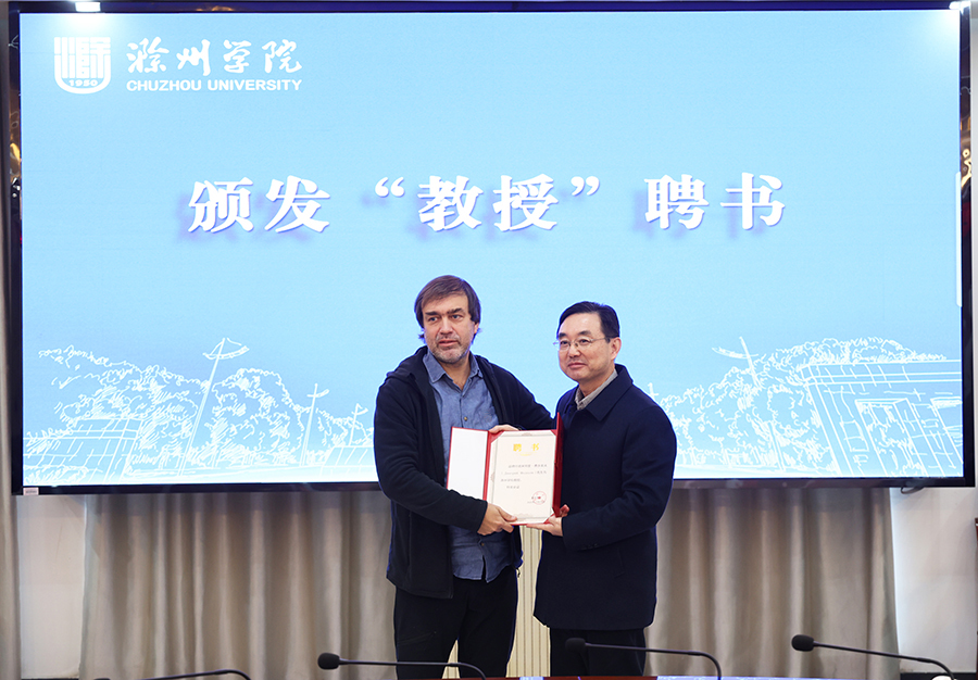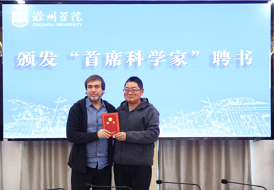 陈桂林为德米特里颁发特聘教授聘书;明光市浩淼安防科技股份公司负责人郭刚建为德米特里颁发首席科学家聘书。