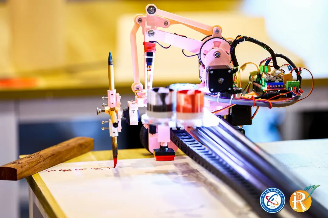 机器人书画赛的现场沉浸在一种静谧而典雅的艺术氛围中。机器人执笔挥毫,泼墨写意,在纸面上勾勒出精妙的汉字与画卷,堪称一场“科技与艺术的对话”。