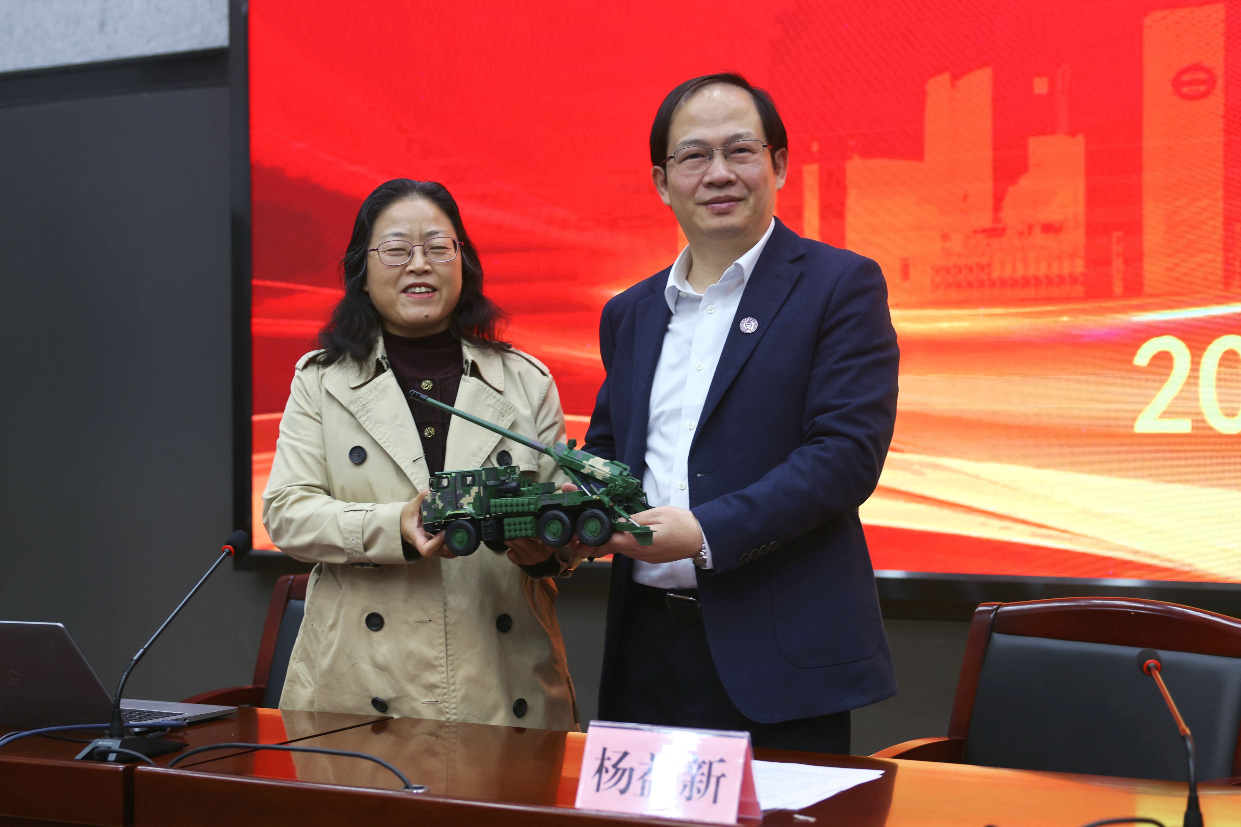 在科学副校长聘任仪式上,杨益新代表学校向新海高中赠送了155车载火炮模型,并寄语新海高中学子,希望他们珍惜学习机会,紧跟时代步伐,永葆科学探索热忱,锤炼思维、勇解难题,以青春之力铸牢报国根基。