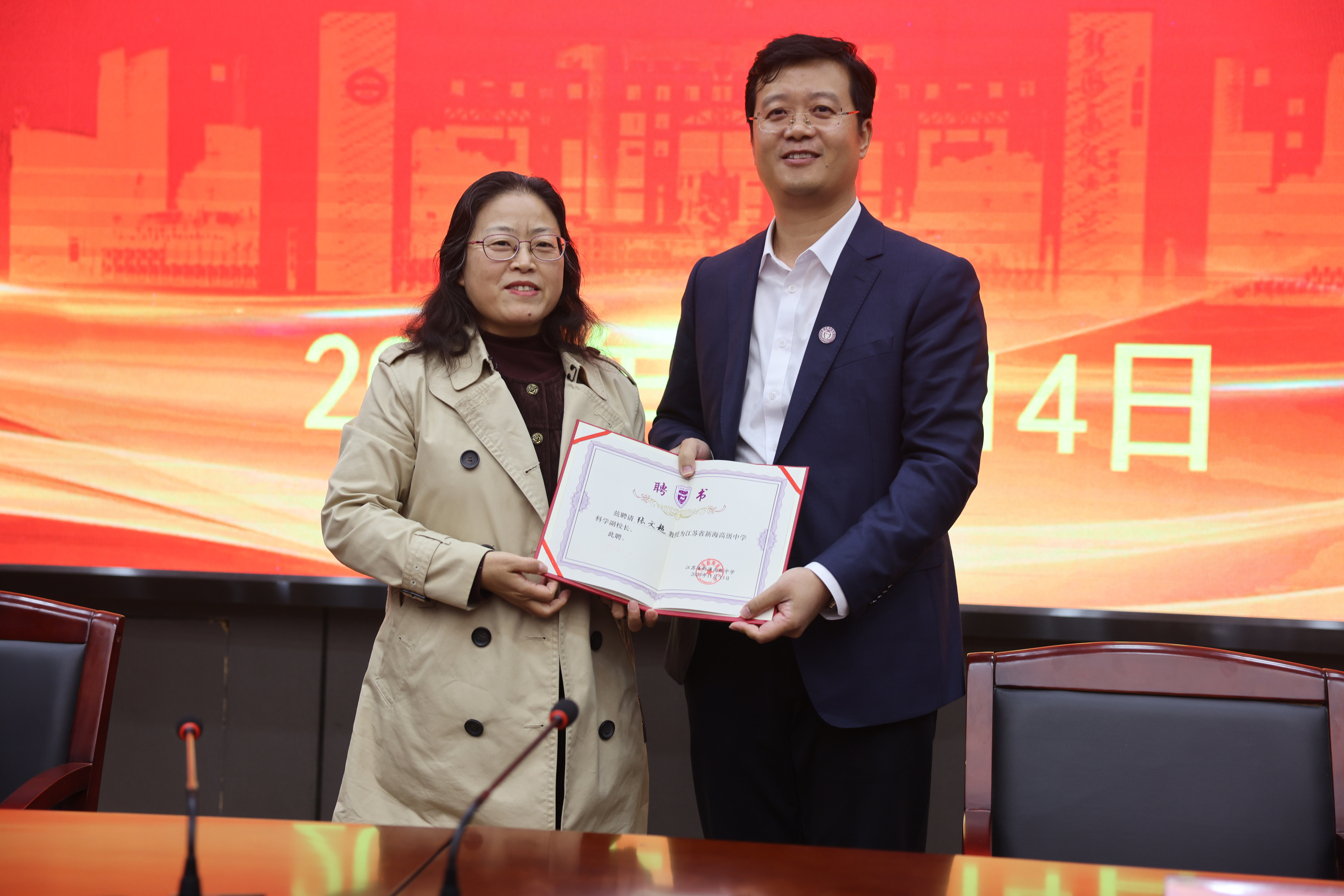 周艳为化学与化工学院党委书记张文超颁发聘书,正式聘任其为新海高中科学副校长。