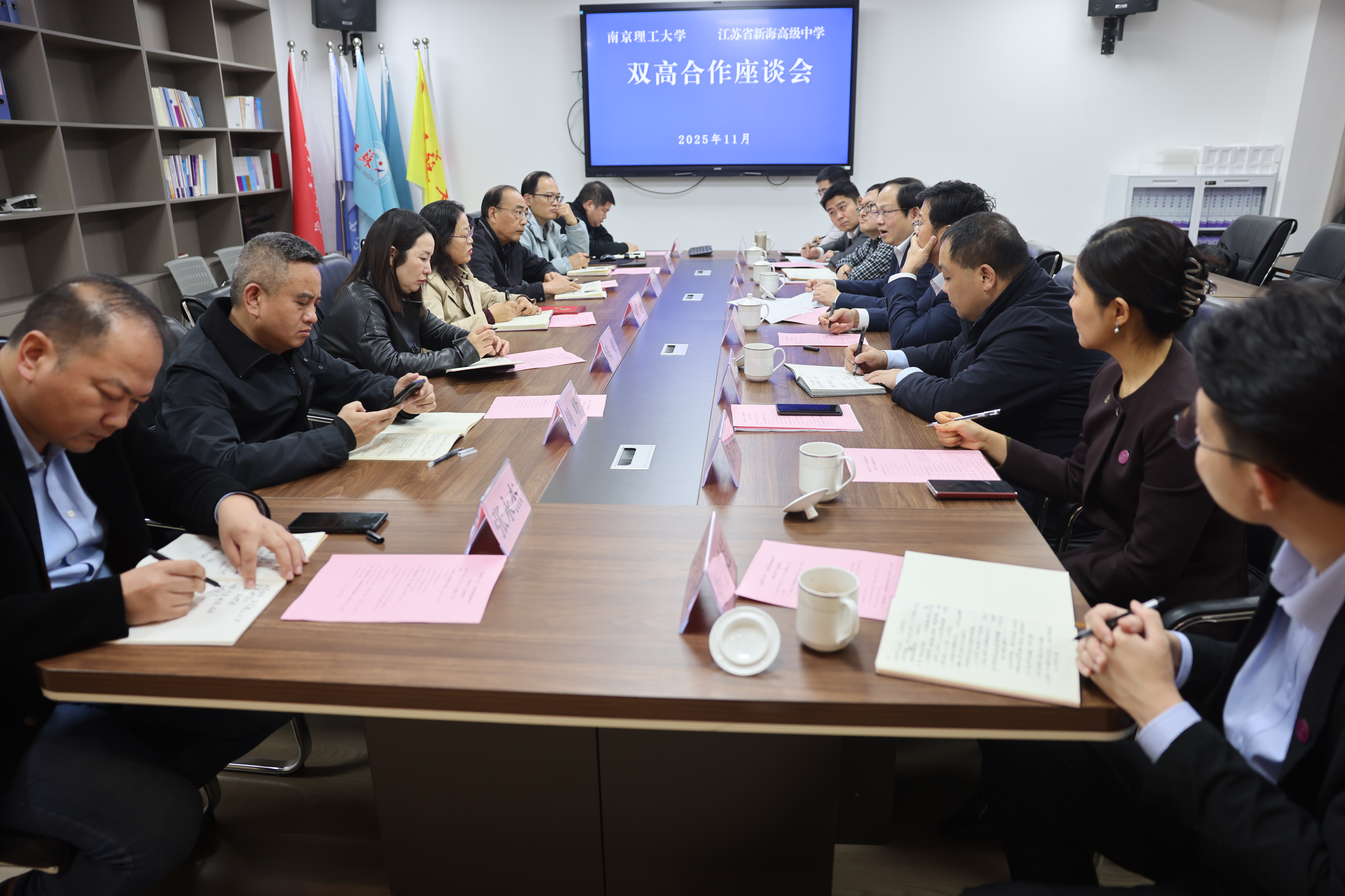 新海高级中学校长周艳,副校长潘家永、陈娟等参加座谈会,双方聚焦“双高合作”展开深入交流。周艳代表新海高中对杨益新校长一行表示热烈欢迎,详细介绍了新海高中的发展历程、办学理念、育人成果,并对南京理工大学长期以来的支持表示衷心的感谢。杨益新介绍了南京理工大学的光荣校史、办学成就及人才培养改革成效,对新海高中长期以来的支持致以诚挚谢意。他指出,两校情谊源远流长,携手共育了众多杰出人才。新海高中始终致力于塑造学生的“国家栋梁特质、学术大师潜质、君子情怀气质”,与我校“工程精英、社会中坚”人才培养定位高度契合,尤其是立足数智化时代,我校着力培养具有家国情怀、军工精神、战略思维、团队协作、自主创新五大核心素养并能引领未来的创新型人才。他希望,未来两校要进一步锚定国家创新驱动发展战略与国防科技人才培养需求,以科学副校长项目为牵引,建强“双高合作”学生科创平台,共享优质师资资源,深入开展交流合作,打通中学教育和高等教育衔接的“最后一公里”,让更多优秀学子在新海高中启航,在南理工成才。