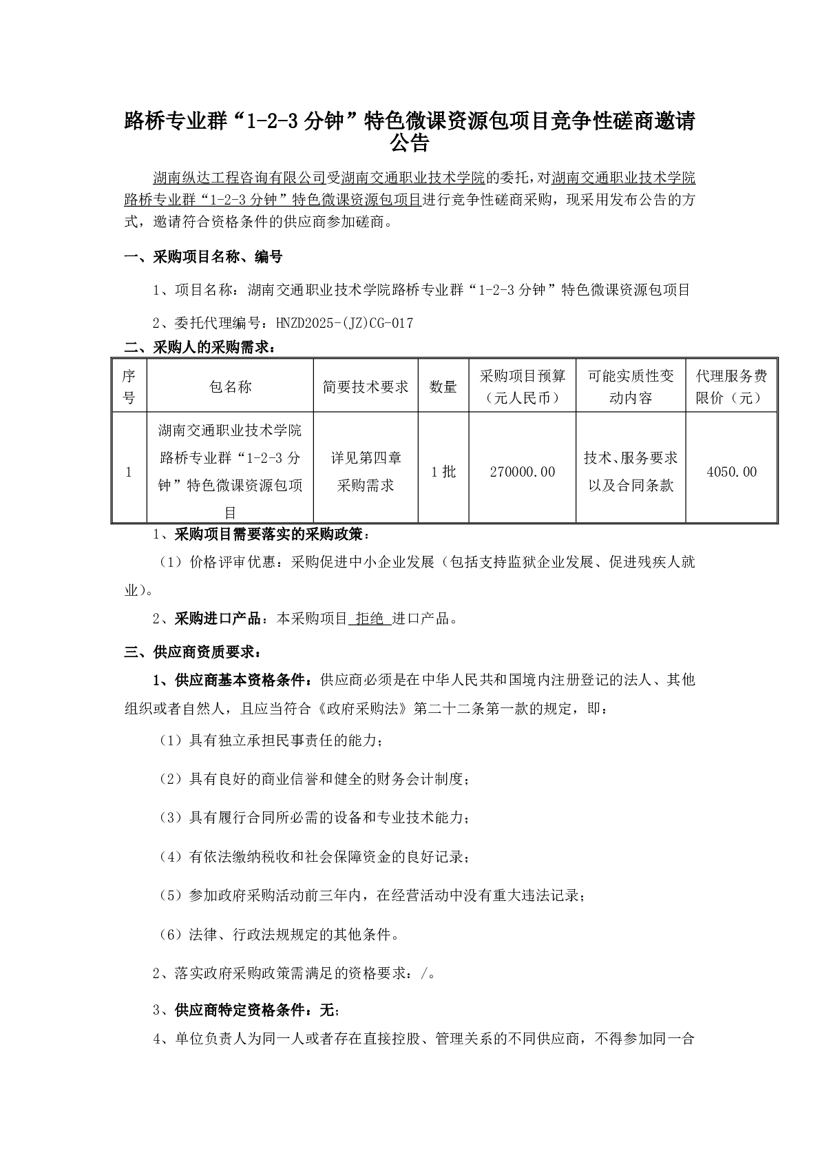 路桥专业群“1-2-3 分钟”特色微课资源包项目竞争性磋商邀请公告