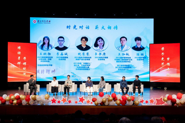 现场,优秀本科生代表陈雨悦、研究生代表林森豪分享了他们的追光心路;生命科学学院20230911班带来班级风采展示,展现了同窗之谊、集体之魂。优秀校友代表、2025届小学教育(胡瑗班)毕业生王欣怡,网易严选贸易有限公司鲍蒙蒙,宁波市第二医院重症医学科副护士长、重症党支部副书记王泓权,与在校生代表李鑫诚、韦书原、陆韬,在传承与对话中接力师院精神。
