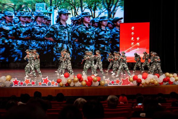 辅导员与学生代表带来了青春励志歌曲串烧;退役大学生士兵代表、军训学生教官沈斌晓带领新生女兵,带来了入列仪式和匕首操表演。